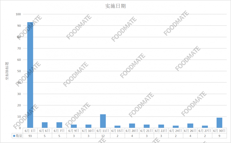 6月1日起,實(shí)施的標(biāo)準(zhǔn)數(shù)量最多,有93項(xiàng),企業(yè)標(biāo)準(zhǔn)實(shí)施日期分別在6月6日、7日、9日、10日、11日、15日、20日、21日、22日、24日、26日、27日、30日。